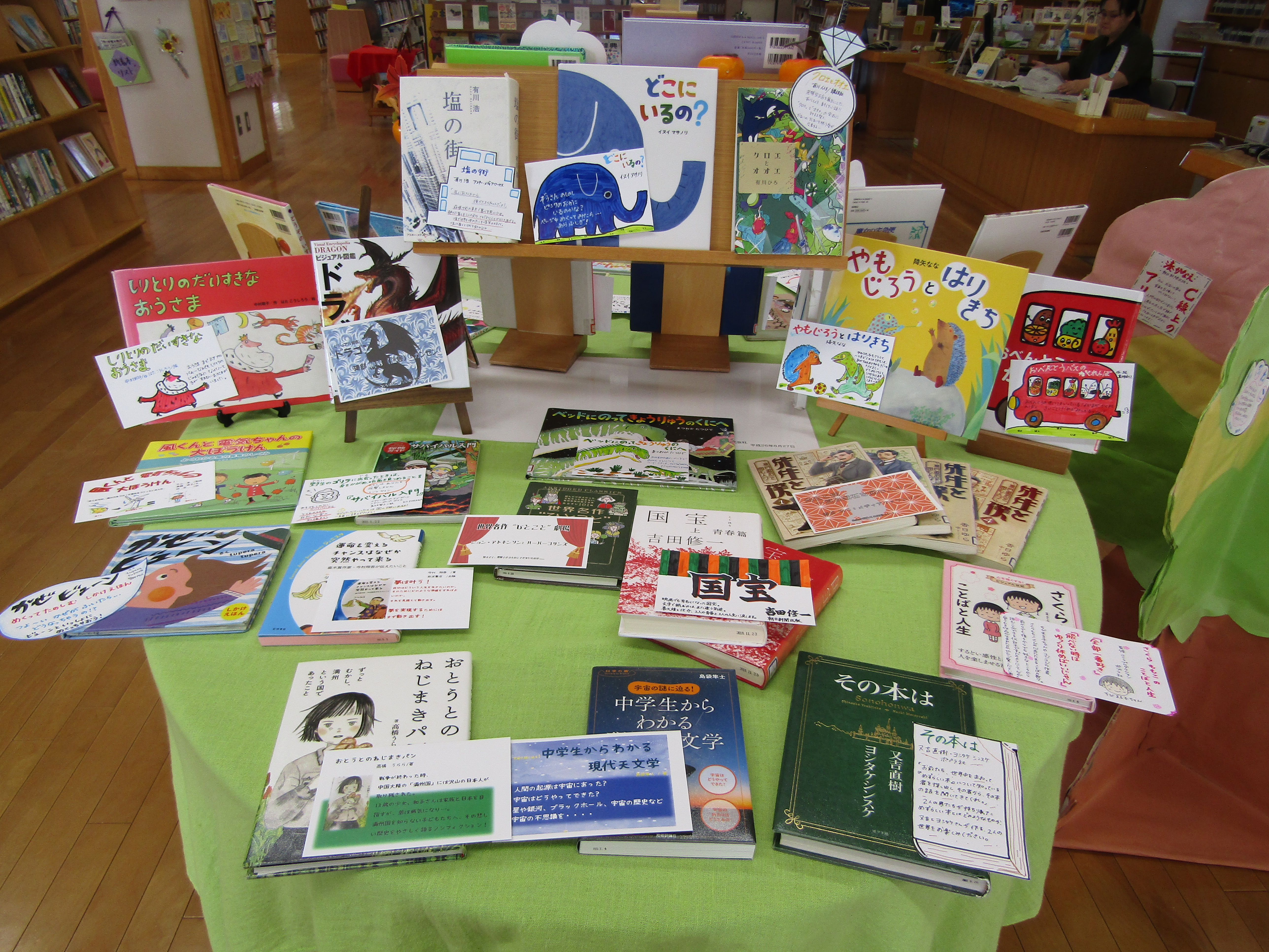 読書の秋!ということで、くりの図書館職員のおすすめの本にPOPをつけて展示しております。毎年恒例の展示となっており、たくさんの方に借りていただいております。